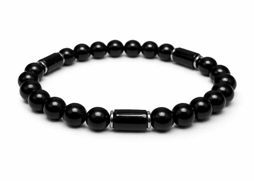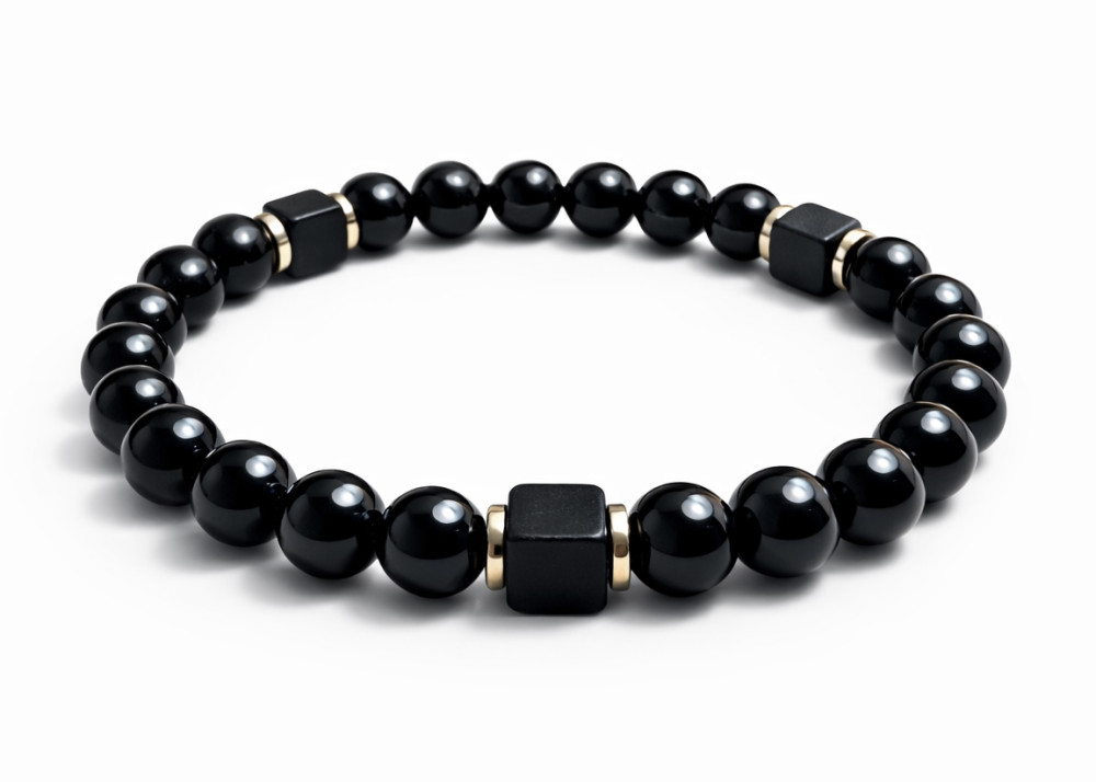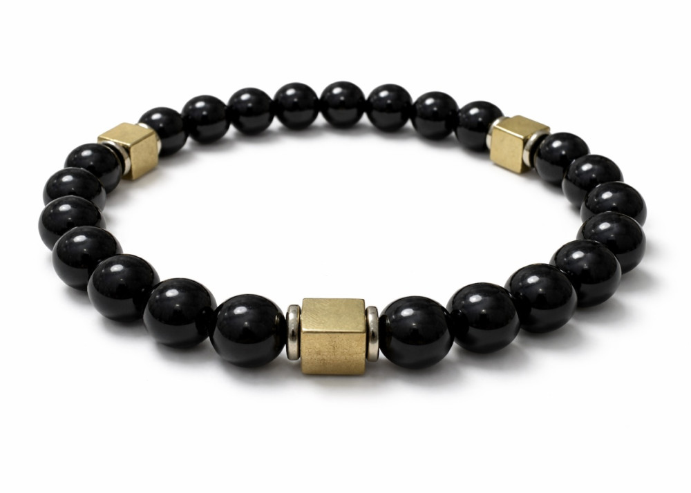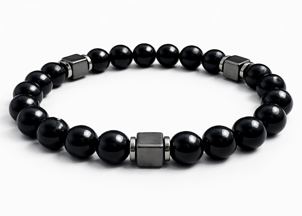 BRANSOLETKA 8 MM ONYKS POŁYSK / HEMATYT GHAN KOSTKA