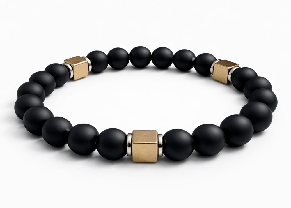 BRANSOLETKA 8 MM ONYKS MAT / HEMATYT ZŁOTA KOSTKA